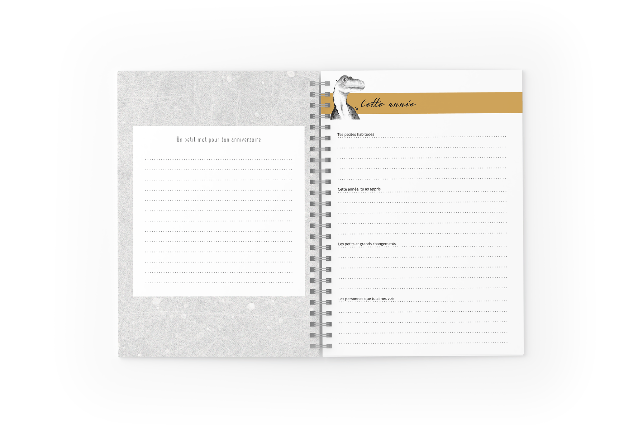 12-18 mois et 18-24 mois / 4 pages par anniversaire de 1 à 5 ans  /  2 pages par année consacrées à la garderie (amovible sans contrevenir au reste du livre si l’enfant ne va pas à la garderie)  /  2 pages par année À propos de toi   /   2 pages par année Moments importants   /   2 pages récapitulatives de l’année   /   Ta croissance   /   Pages vierges à la fin pour photos ou informations additionnelles